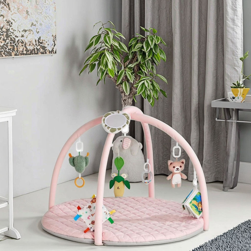 Baby Activity Play Gym Mat with Hanging Toys & Sensory Elements – Soft Quilted Playmat (Pink)