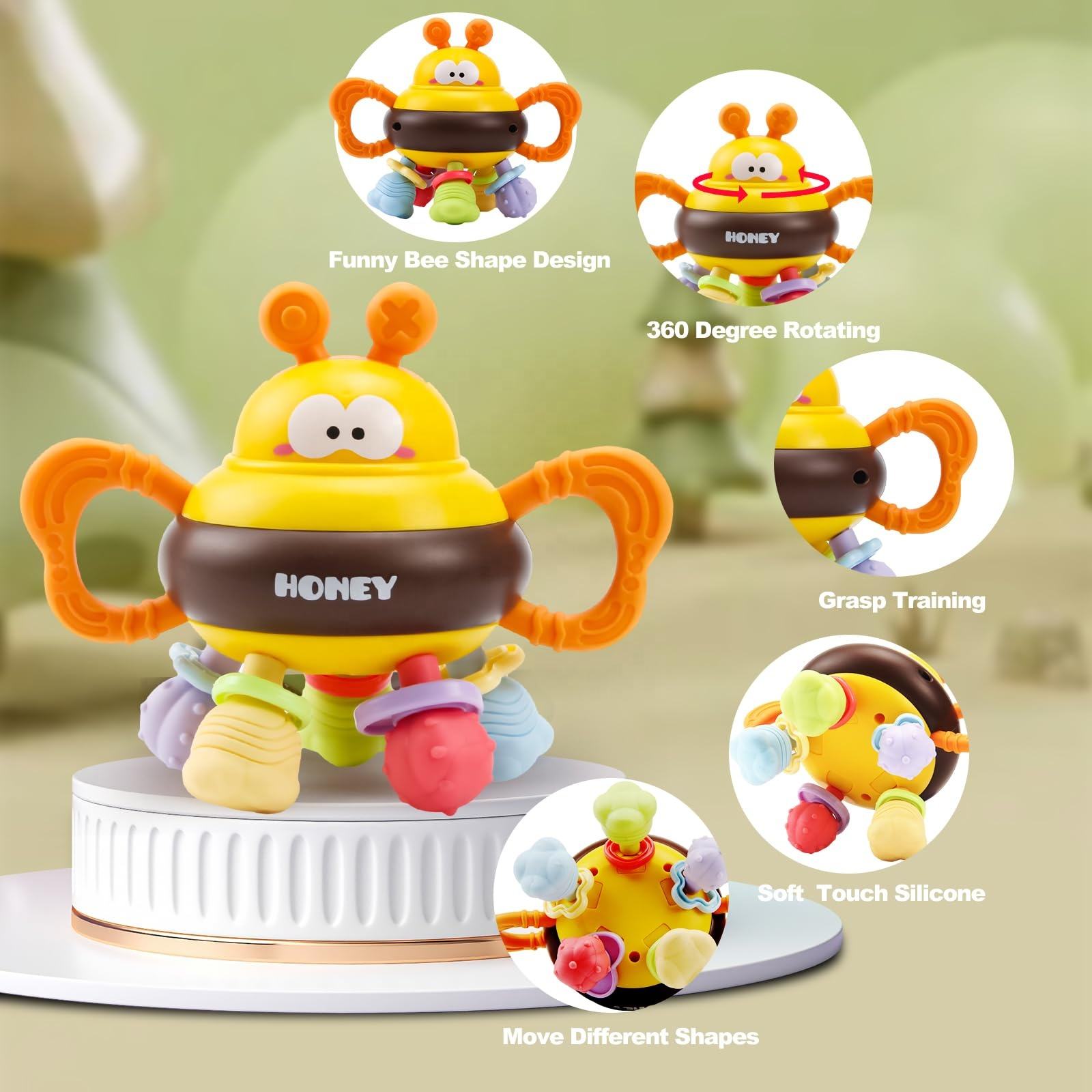 The easy-to-hold side handles help babies develop a firm grip, while the rotating center and multiple textured shapes encourage touch, movement, and curiosity. The soft silicone teething parts provide a soothing chewing experience during teething stages.