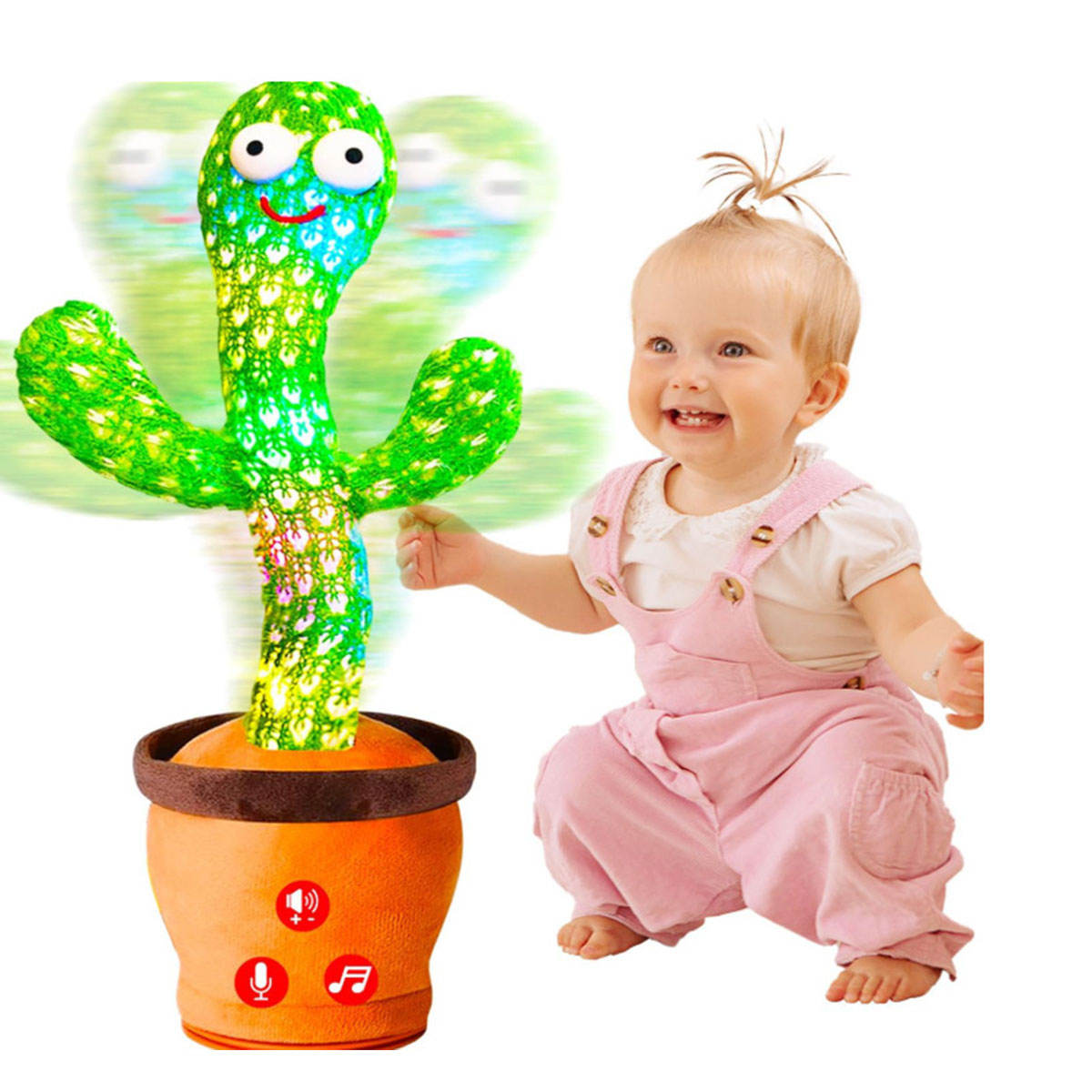 A fun and interactive plush cactus that lights up, dances, and repeats what you say in a playful voice. Designed to bring smiles, laughter, and engaging playtime for kids at home.